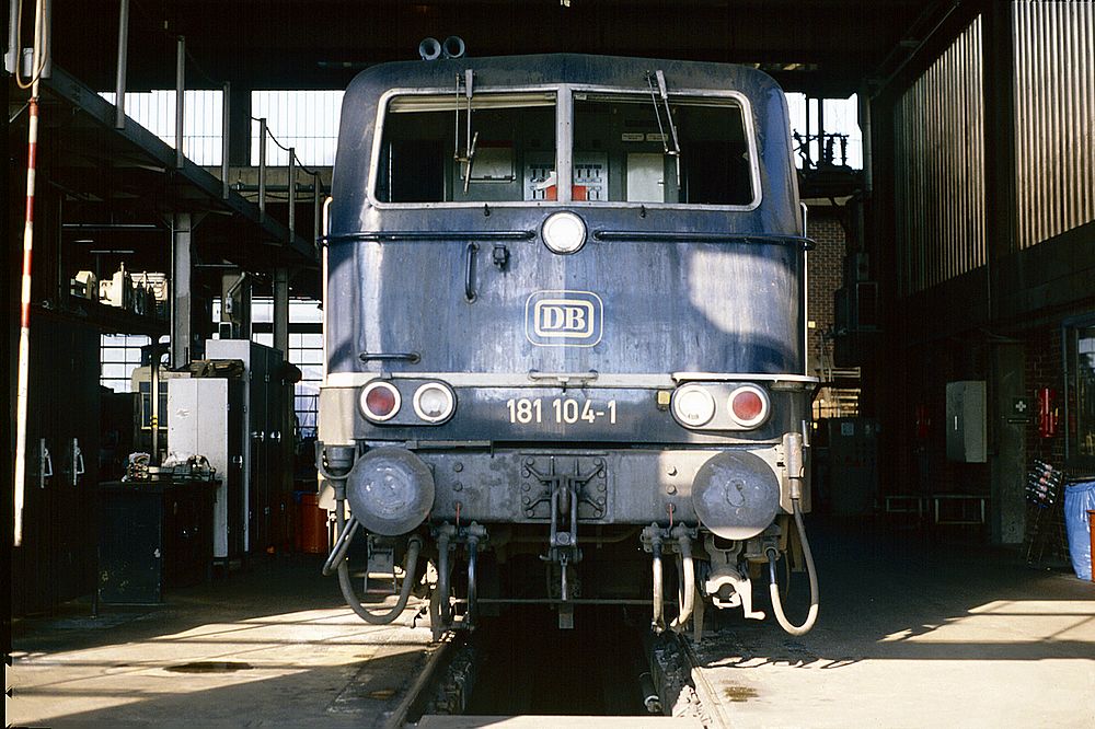 Vorheriges Bild | Zurück zur Übersichtsseite | Nächstes Bild Übrig blieb neben der recht zuverlässigen 181 001 nur noch die sehr störanfällige 181 104, die am 7. September 1988 in der Halle des Bw Saarbrücken steht.