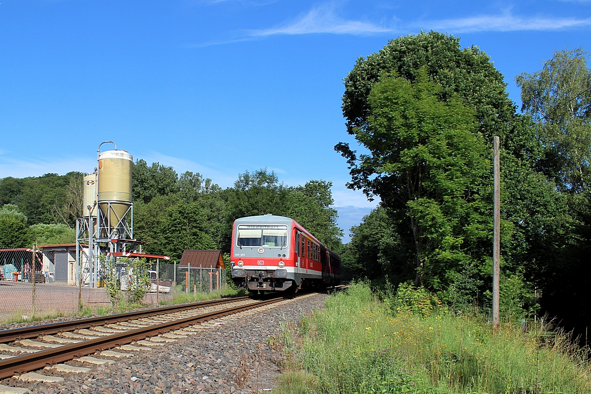 Um 8:50 Uhr hat der Zug als RB 12959 nach Dillingen gerade den Ortsrand von Siersburg erreicht und passiert das Gelände des Gemeindebauhofs.
