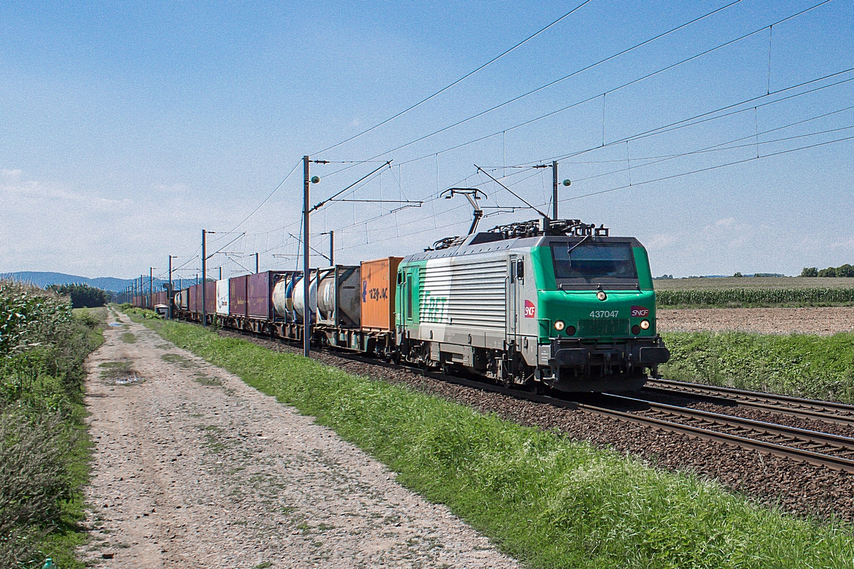 Vorheriges Bild | Zurück zur Übersichtsseite | Nächstes Bild Ein weiterer Containerzug fährt mit 437047 um 14:32 Uhr kurz vor Hochfelden vorbei