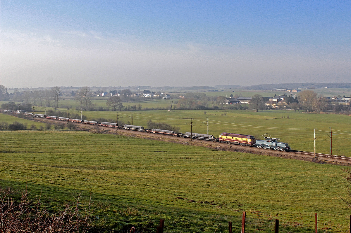 Vorheriges Bild | Zurück zur Übersichtsseite | Nächstes Bild Hier ist sie wieder: 3608 mit 1818 um 14:34 Uhr vor dem Güterzug TRM 36008 aus Belval-Usines nach Bettembourg