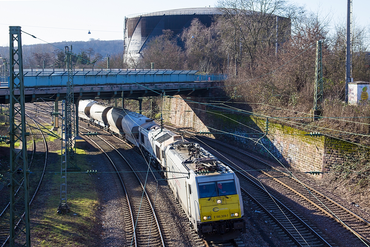 Vorheriges Bild | Zurück zur Übersichtsseite | Nächstes Bild Am 16. Januar 2020 kommt 186 309 mit einer Class 77 und vier Schüttgutwagen als EZ 49235 Blainville - Mannheim Rbf durch Saarbrücken-Malstatt